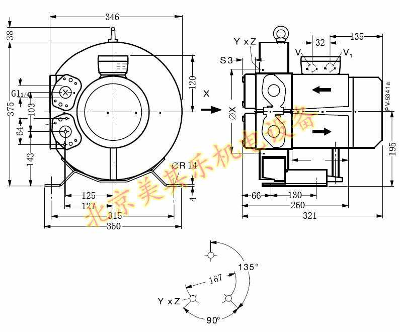 4GH410/1.1k0w高壓鼓風(fēng)機(jī)側(cè)面圖,風(fēng)機(jī)的進(jìn)出風(fēng)口位于電機(jī)的左側(cè)